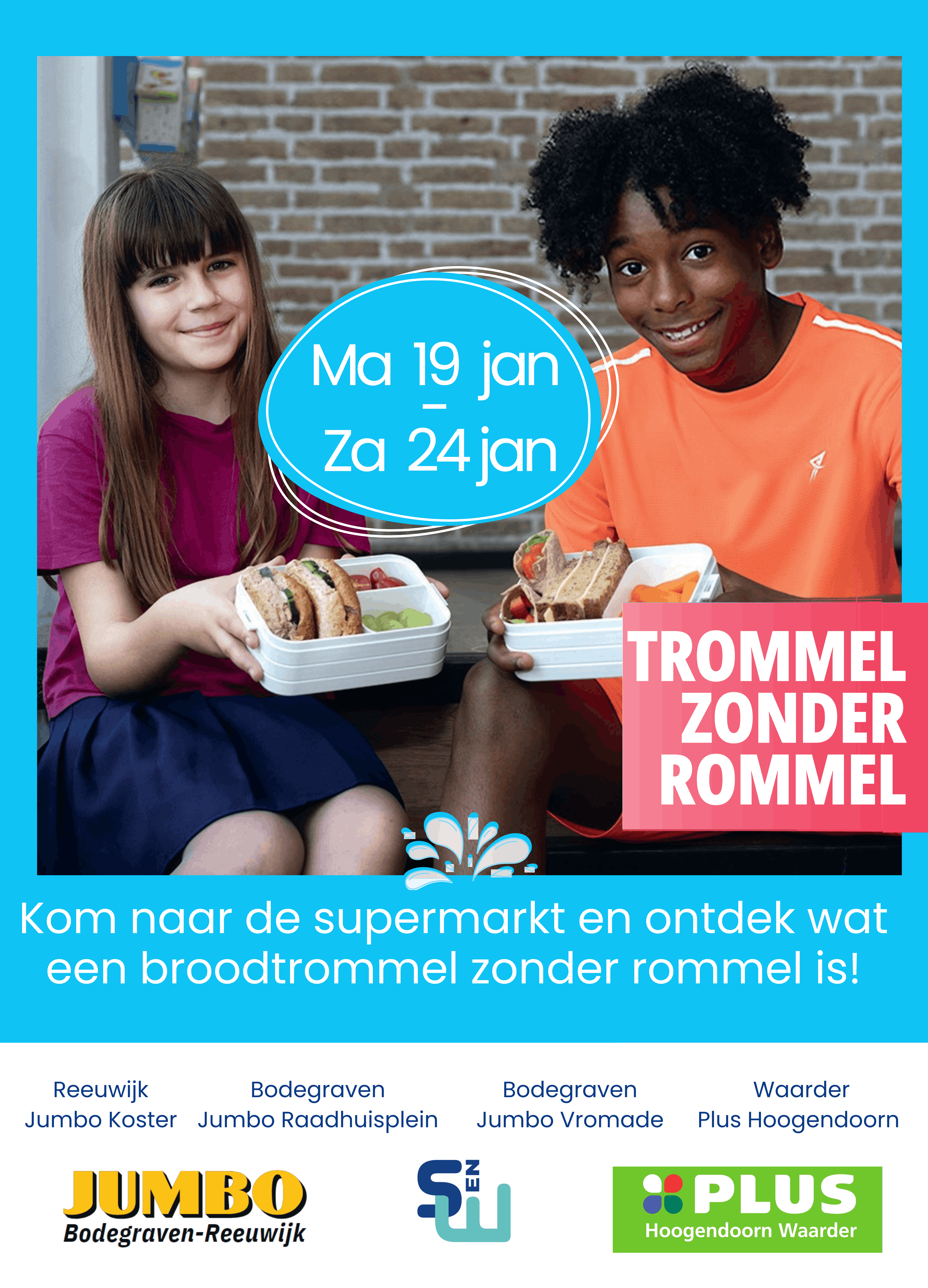 Van maandag 19 januari t/m zaterdag 24 januari wordt daarom in de gemeente de campagne ‘Trommel zonder Rommel’ opgezet door Sport en Welzijn Bodegraven-Reeuwijk. De campagne houdt in dat er in 4 supermarkten (PLUS Waarder, Jumbo Koster Reeuwijk, Jumbo Vromade Bodegraven en Jumbo Raadhuisplein Bodegraven) aandacht komt aan het bevorderen van een gezonde broodtrommel. Want wat is eigenlijk gezond? En hoe maak ik een gezonde broodtrommel, ook als ik weinig tijd heb? In elke supermarkt staat de hele week een kraampje waar je alles te weten kan komen over een gezonde broodtrommel. Er zijn brochures en flyers beschikbaar met informatie en tips en door de winkel heen vind je nog meer dingen over gezond eten. Kinderen kunnen met de op school gekregen bingokaart en voucher langs één van de supermarkten. Dit kan de hele week conform de openingstijden van de supermarkt.